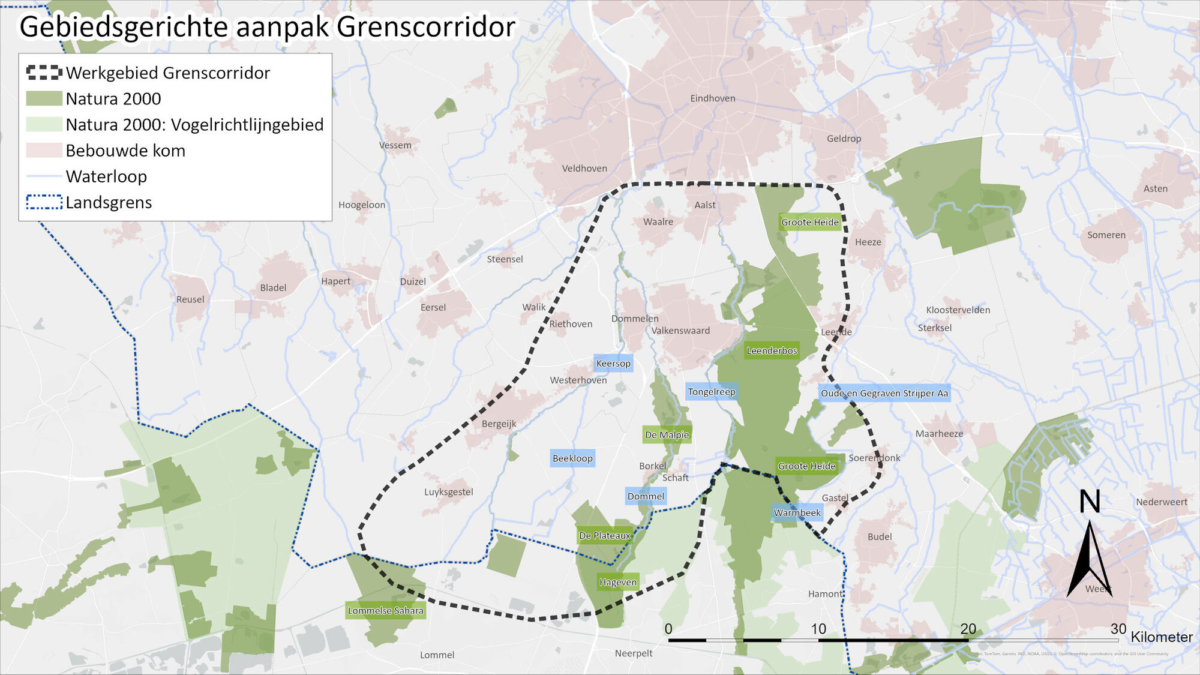 Grenscorridor bevat het buitengebied van gemeenten Cranendonck, Geldrop-Mierlo, Heeze-Leende, Valkenswaard, Waalre en Stad Lommel (B), een groot deel van gemeente Bergeijk en een stukje van gemeente Veldhoven. In Grenscorridor liggen delen van beschermde natuurgebieden, zoals Leenderbos, Groote Heide en De Plateaux. Het landelijk gebied van Grenscorridor is prachtig. Samen kunnen we het nog mooier maken door water en bodem op orde te brengen. Zo maken we een omgeving waar het fijn wonen en werken is. Dat is belangrijk voor de natuur, het landschap, de landbouw en de gezondheid van de mensen in het gebied.